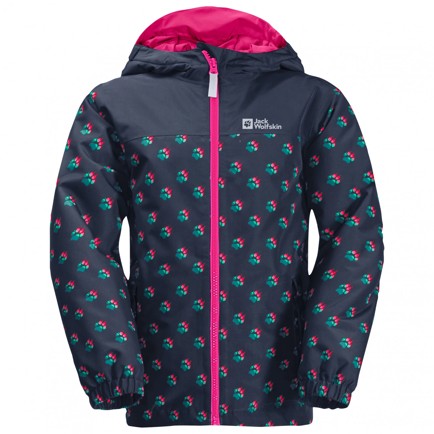 As for insulation, it has a Texatherm Core Ecosphere with a thickness of 120 g/m² and 100 g/m². The padded synthetic fibre fabric is also made of recycled raw materials and provides warmth and breathability. As a result, the jacket allows moisture caused by sweat to escape quickly to the outside. The waterproof front zip, warm hood and pretty print perfectly complete the Jack Wolfskin winter jacket.